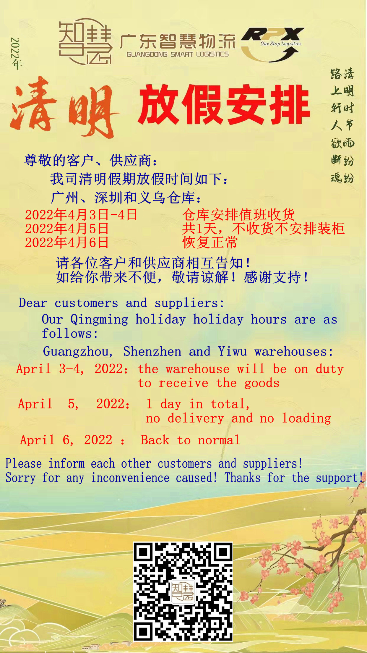 廣東智慧國(guó)際物流2022年(nián)清明放(fàng)假安排。